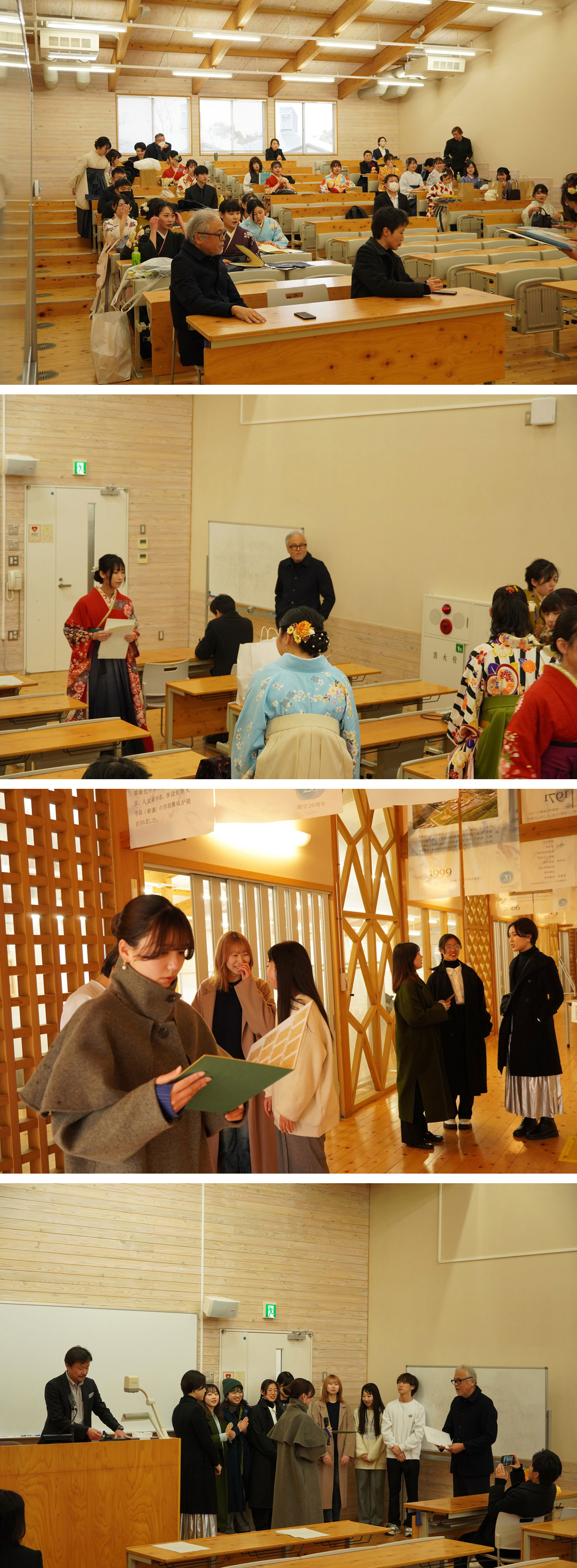 2024年3月27日 第26期生の卒業式 2024年03月20日に、生活デザイン学科26期生の卒業式がありました。 皆さん、ご卒業おめでとうございます。 そして、20年間という長きに渡り、道具分野&構想分野の教育をご担当していただいた印南比呂志先生も滋賀県立大学を退職することになりました。印南先生、長い間、誠にありがとうございました。